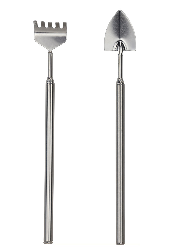 Eine bis auf ca. 60 cm ausfahrbare Harke, sowie ein gleich langer Teleskop_Spaten.